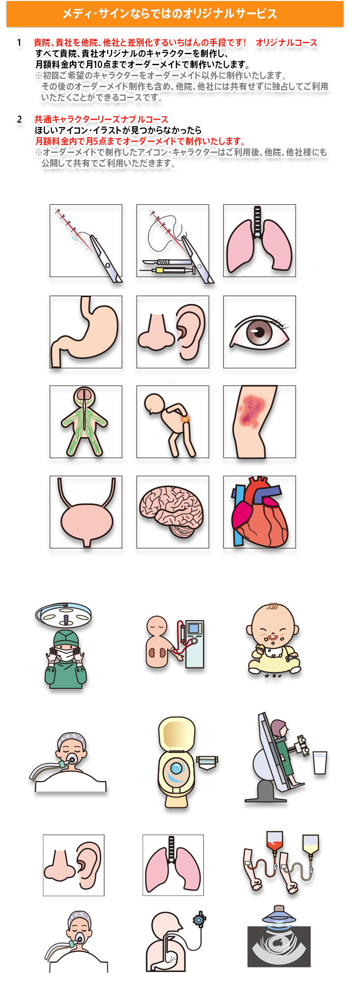 このような15年間病院様、医療機関様のサイトの制作、運営、管理をさせていただいたノウハウを活かし、「イメージにあうアイコン・イラストが見つからなかった」場合、気軽に月最高5つまでのアイコン・イラストのオーダーを料金内で承れるシステムを採用いたしました。